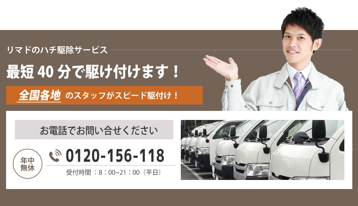 電話をかける(click)ハチ駆除をお考えの際は、プロのハチ駆除業者に依頼することをおすすめいたします。ベランダ、軒下、家の玄関や庭などにハチの巣が作られてしまうと、ハチが部屋の中に入ってしまわないか、ハチに刺されてしまわないかと心配ですよね。また家の周りで蜂が飛んでいると、お隣やご近所の方にもハチ被害でトラブル、ご迷惑をお掛けすることにもなってしまいます。そうなってしまう前にハチ駆除会社に依頼をしてスムーズに解決してしまいものです。それでは、多くの業者の中からどの業者に依頼すればいいのでしょうか?依頼を検討するにあたり、料金や対応の早さ・正確さ、アフターサービスなど気になることは多くありますよね。そこで少しでも低価格、早く、安全、安心に蜂の巣駆除を終わらせるために業者選びで知っておきたいポイントをご紹介します。まず、ハチ駆除料金を比較する際は事前に現地調査を行ってもらいましょう。駆除にかかる費用は、巣の大きさ・場所・高さ、ハチの種類によって変わってきます。また、蜂の巣は軒先や窓際といった場所だけでなく屋根裏(天井裏)、床下といった見つけにくい場所に作られることもあります。そのため正確な見積もりを提示してもらうためにも十分な現地調査は欠かせません。また、駆除の値段はお客様によってそれぞれなので、見積もり価格が業界の相場・適正料金か見極めるのも難しいことかと思います。よくあるトラブルは現地調査が不十分で追加工事・追加料金が発生してしまった、作業費用と清掃費用が別途料金で請求金額が見積りから大きく増えてしまったというものです。そこで見積もりの詳細(内訳)を納得できるまで丁寧にわかりやすく説明してくれる業者が信頼出来る優良業者といえます。また、今日中(本日中)に、翌日にでもハチ駆除を終わらせたいというお客様もみえることかと思います。そこで依頼から即日対応・即日解決・即日駆除ができる業者をおすすめいたします。そして、徹底的にハチ退治、ハチの巣除去をしてもらうために、蜂の巣駆除会社の実績も確認しておきましょう。ハチ駆除には資格や免許、許可などが必要ないので知識や技術がない素人でも作業ができてしまいます。その際、対応が不十分だと戻りバチや蜂の巣の再発といった問題が起きてしまうこともあります。実績豊富な業者であれば、ハチ駆除の知識や技術を持つ専門家のスタッフが駆除から蜂の巣の撤去・処分、再発防止のケアまで行うことができます。また、口コミやランキングサイトで業者の評判も調べてみましょう。評価の高い人気の業者、おすすめされている業者の具体的な対応や施工例など業者選びの参考になるかと思います。弊社では、ご相談、現地調査、お見積もりまで全て無料でご利用頂けます。現地調査の際は、ご依頼から最短40分で駆けつけ、緊急時にもご対応いたします。ミツバチは10,000円から、アシナガバチは11,000円、スズメバチは13,000円から適正料金でハチ駆除サービスをご案内しております。プロの駆除技術にあわせて専用の薬剤を使用することで徹底的な蜂駆除、蜂の巣の除去から、戻り蜂対策、再発予防までしっかりと行います。また、年中無休365日・通話料無料の相談窓口を設けております。ご相談には研修を受けた専門スタッフがご対応いたしますのでちょっとした質問からでも、お気軽にご相談ください。安心・安全にハチ駆除をしたい、ハチ被害でお悩みの方は、まずは弊社にお問い合わせください。